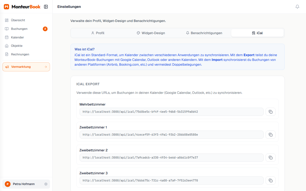 Mit dem iCal-Export kannst du deine Buchungen aus MonteurBook in externe Kalender-Apps einbinden. So hast du alle Termine an einem Ort – egal ob im Google Calendar auf dem Handy oder in Outlook am Schreibtisch.